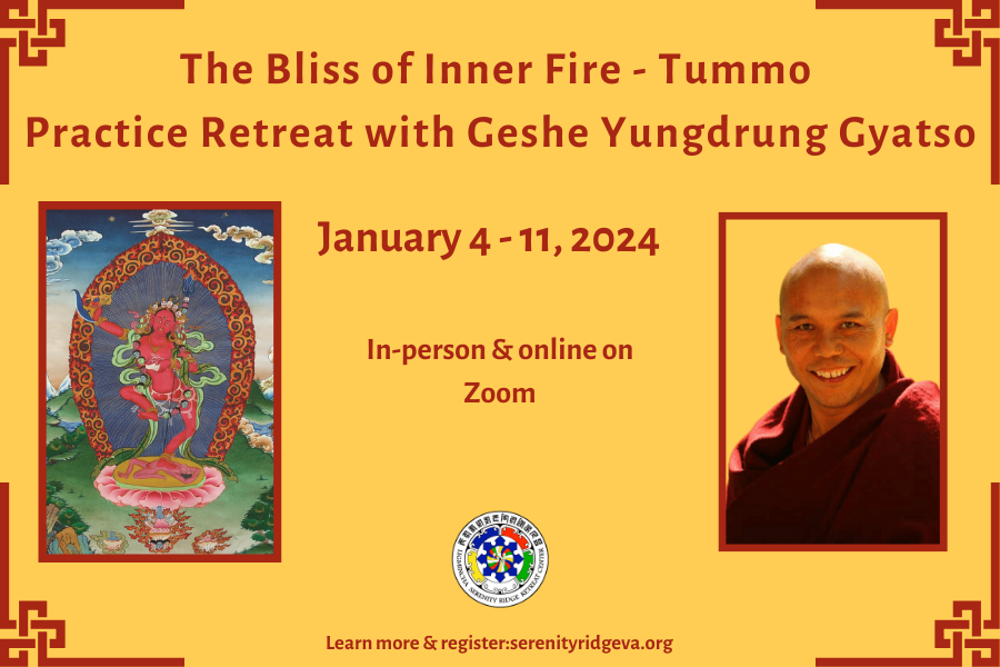 Join us this January for our first Tummo practice retreat at Serenity Ridge! Led by Geshe Yungdrung Gyatso, this retreat is intended to support practitioners who have participated in Tenzin Wangyal Rinpoche’s Tummo teachings. Geshe Gyatso will give some instruction and advice on all the components of Tummo that Rinpoche has covered in his current teaching cycle: the prayers, nine breathings, tsa lung, the ordinary and extraordinary preliminaries, and the practice of jam lung; but the focus will be on developing a deeper familiarity and experience with the practices. Geshe-la will also be available for private meetings to discuss the practice for students who attend in person.